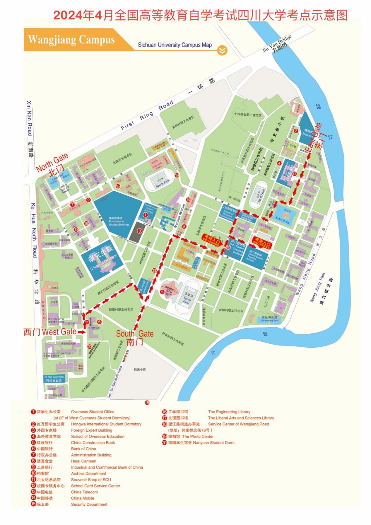 以下为考点及进校路线示意图,建议考生从东门进入。如遇校内交通管制,请按当天学校安保人员指示行进。
