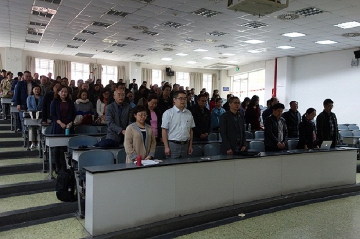 现场老师全体起立,在庄严肃穆的国歌声中迎接大会的开幕。