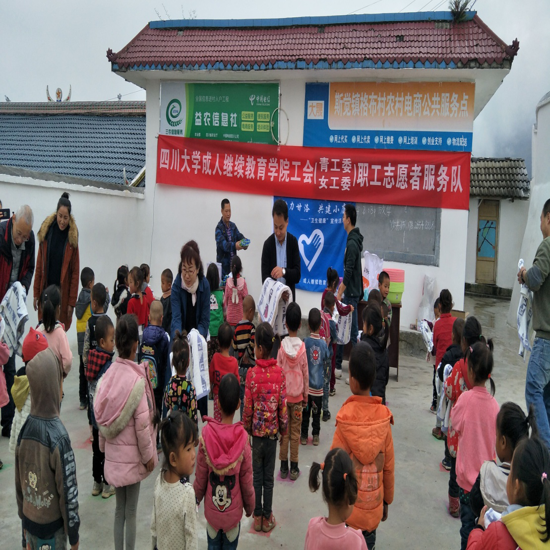 10月12日,成人继教教育学院分工会赴甘洛县扶贫志愿服务队一行来到斯觉镇格布村,对格布村幼儿园的小朋友们进行了专程慰问,把学校工会为他们购买的洗漱用品等发到每位小朋友手上,并鼓励他们好好学习,养成好的生活习惯,健康快乐地成长。