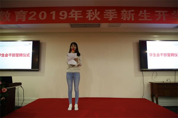 随后举行了学生会干部受聘仪式——高主任为19年秋季新选举的三名学生会干部颁发荣誉聘书。学生会代表发言指出,学生会是切实为同学服务的团体,是联系老师和学生的桥梁与纽带。李欢同学表示,很高兴成为学生会的一员,将会严格要求自己,坚持以学生会宗旨为工作目标,在学习和行为方面,