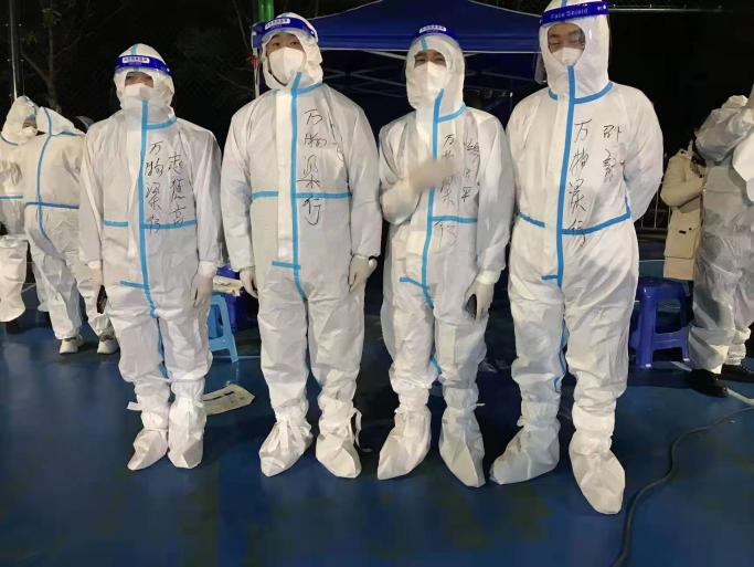 很荣幸自己能够成为“逆行”这个“大家庭”,11点,通知我们所有的工作人员做核酸检测,随后又收拾物质,下午1点,连续两场战斗种终于落下帷幕,若有战,召必回。 在此,为这次抗疫奉献的工作大家庭的各位同事表示崇高的敬意,也很荣幸能与他们携手共同打这场战斗。